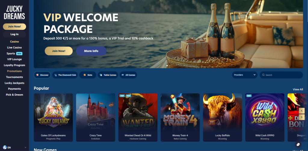 Beim Betreten von Lucky Dreams fällt sofort das moderne, optisch ansprechende Design ins Auge. Dunkles Theme, Neon-Akzente und eine intuitive Navigation schaffen eine immersive Atmosphäre, die Spieler direkt fesselt. Menüs sind übersichtlich, Such- und Filterfunktionen funktionieren zuverlässig. Die Plattform läuft sowohl auf Desktop als auch auf mobilen Browsern flüssig, ohne Verzögerungen oder Aussetzer. ⚡📱