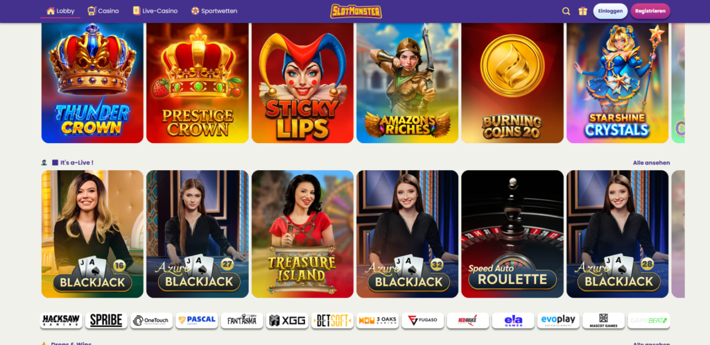 Der wahre Charme von SlotMonster liegt in der riesigen Spielesammlung. Mit Top-Anbietern wie NetEnt, Play’n GO, Evolution Gaming und Pragmatic Play ist die Vielfalt überwältigend.